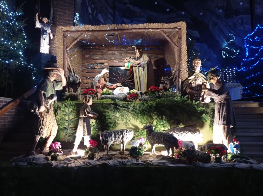 Po obu stronach prowadzących do ołtarza schodów ustawiono liczne figury pasterzy i pielgrzymów, niosących dary i pochylających się w geście adoracji. Scena została wzbogacona o realistyczne postacie zwierząt – owce, osła i woła – rozmieszczone wśród elementów krajobrazu. Całość dopełniają czerwone poinsecje oraz ciepłe, punktowe oświetlenie, które wydobywa detale figur i tworzy nastrojową grę światła i cienia.