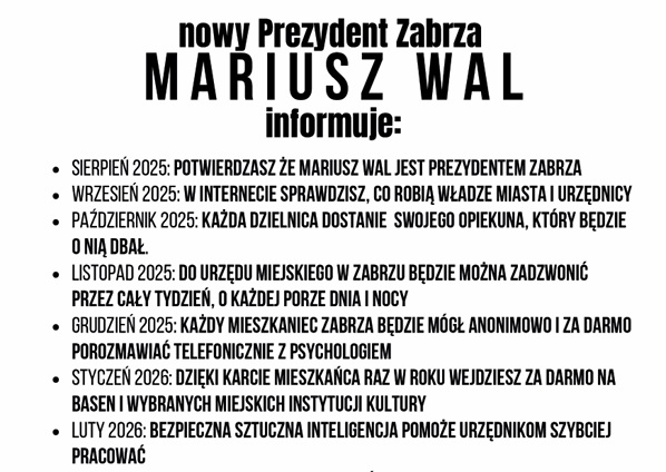 Nie zdążył zostać kandydatem, ale zdążył wykupić billboardy. Mariusz Wal, „wieczny kandydat”, nie zebrał wymaganych 3 tysięcy podpisów, by wystartować w przedterminowych wyborach na prezydenta Zabrza. Choć oficjalnie wyeliminowała go Miejska Komisja Wyborcza, kampania już trwała – w centrum miasta pojawiły się bilbordy z jego nazwiskiem. Historia, która przypomina losy Eddiego „Orła” Edwardsa – człowieka, który bardziej niż wynikami, zapisał się w pamięci swoją determinacją i uporem.